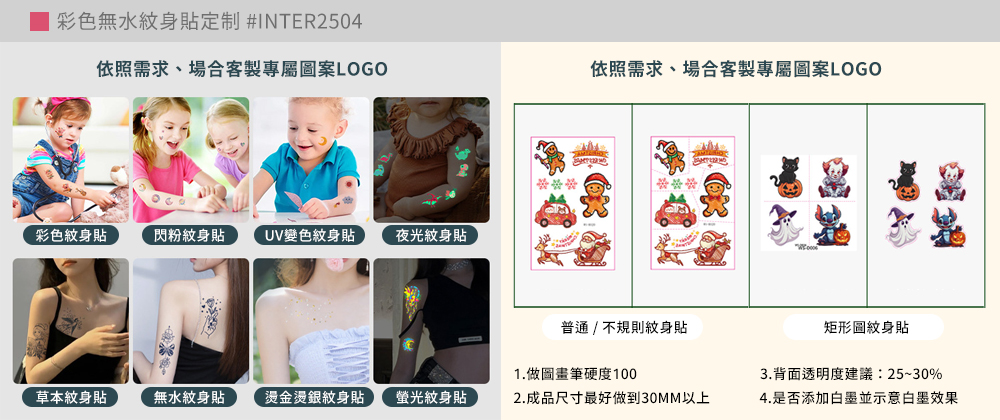紋身貼 ◆ 無水紋身貼紙 ◆ 防水防汗 ◆ 來圖定製 ◆ 單色 / 彩色 / 夜光紋身貼紙 ※注意事項 : 尺寸因個人測量習慣與方式不同,誤差±5%屬正常範圍。 螢幕顯示各有差異,實際顏色以實品為主。 加入詢價車 立即詢價 分享到 商品詳情 回上一頁